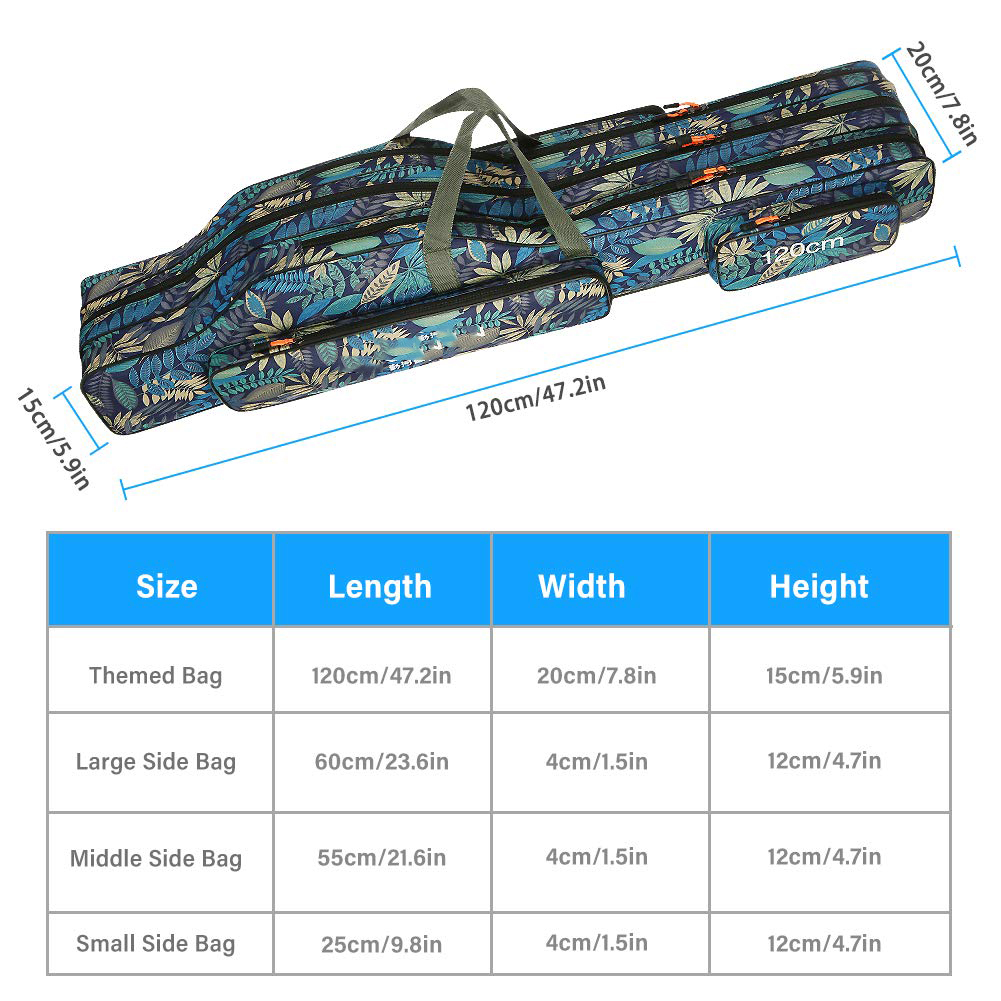 1. 【Large Capacity】 — Dimension: 47.2×7.9×5.9in, Belly height 9.8in. The fishing storage bag includes 3 main compartments and 3